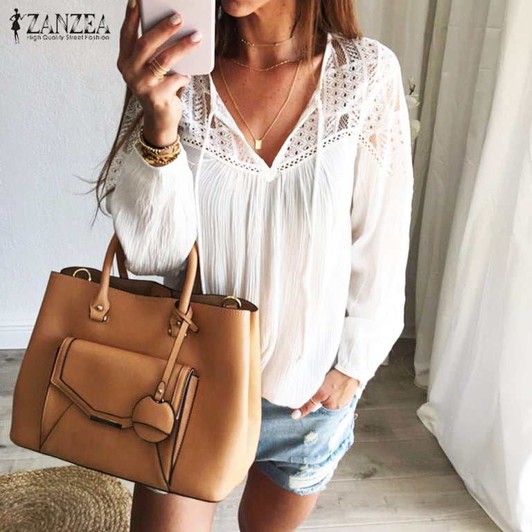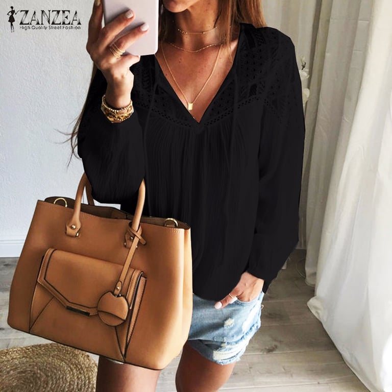 Damesblouse met lange mouwen en een V-hals met strik. De decolleté is versierd met kant. Losse pasvorm.