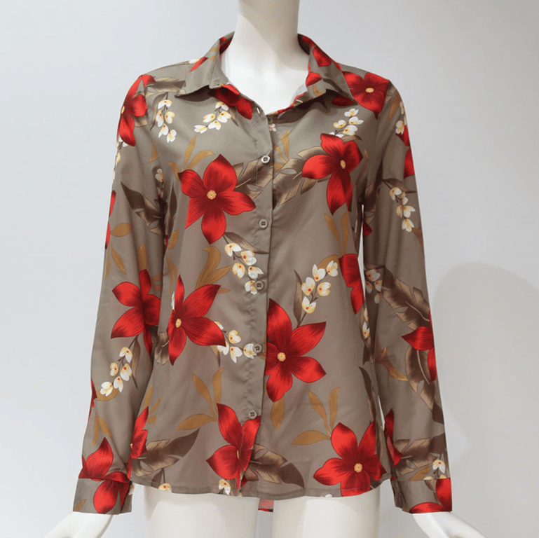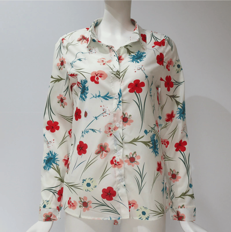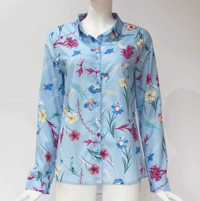 Damesbloes met bloemenprint. De bloes heeft lange mouwen.