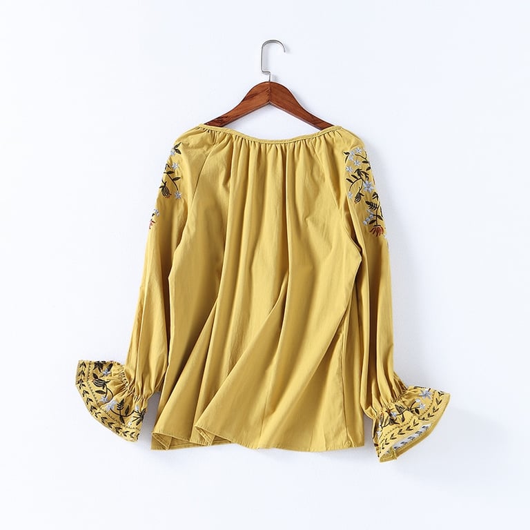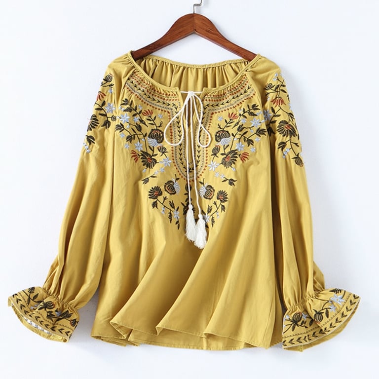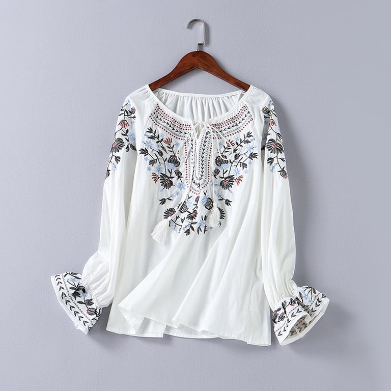 Hoogwaardige blouse met handgestikte bloemen. Lange mouwen.