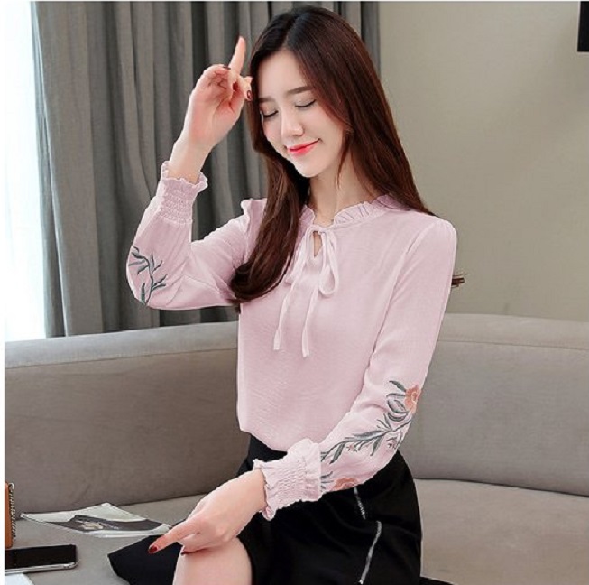 Prachtigebloes met een strik bij de kraag en een bloemenpatroon op de mouwen.