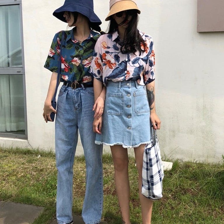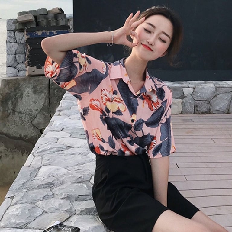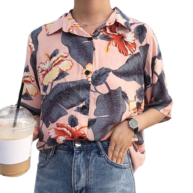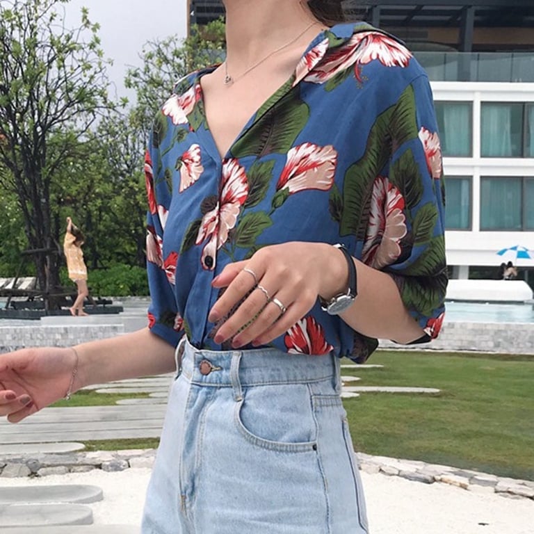 Heeft een print van verschillende bloemen en bladeren, die symbool staan voor warm weer.