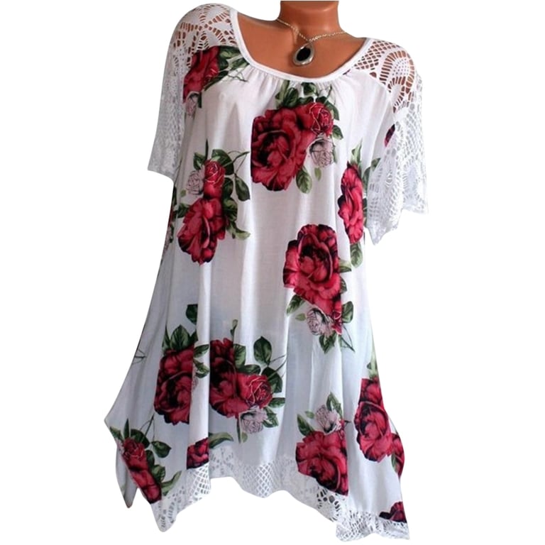 Heeft een bloemenprint en kantmouwen.