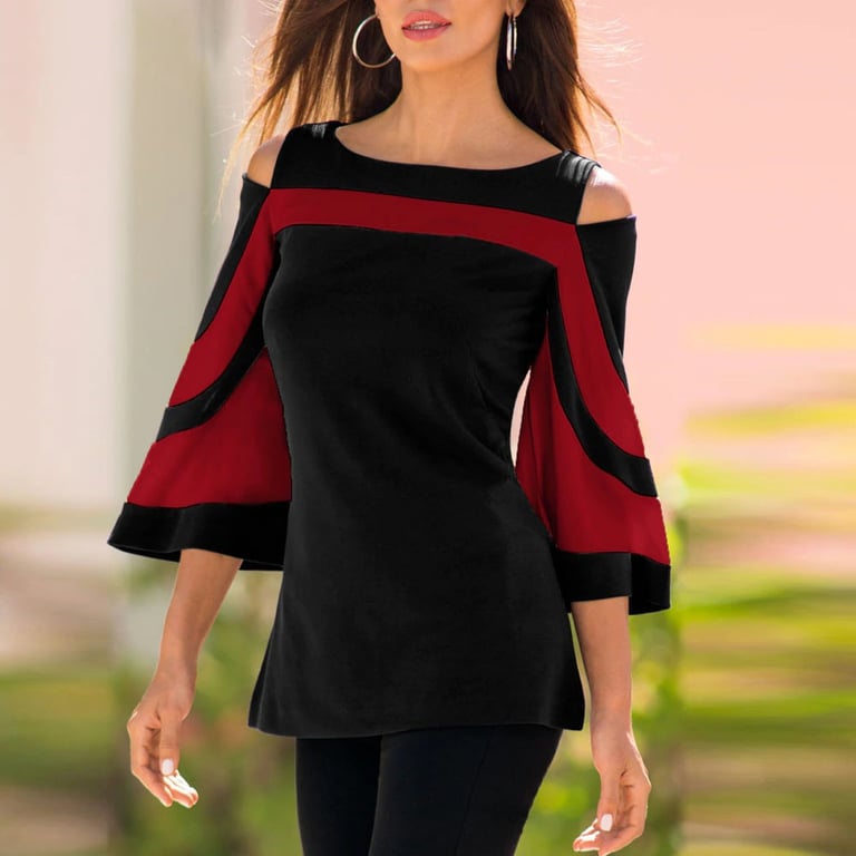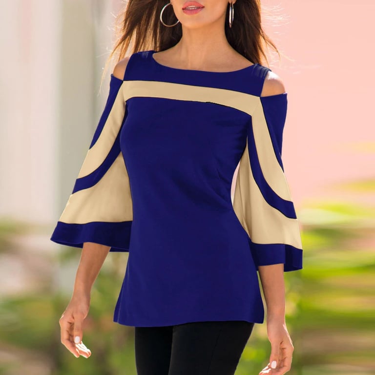 Mooie blouse met blote schouders en 3/4 klokmouwen. Het heeft een ronde halslijn en loopt uit.