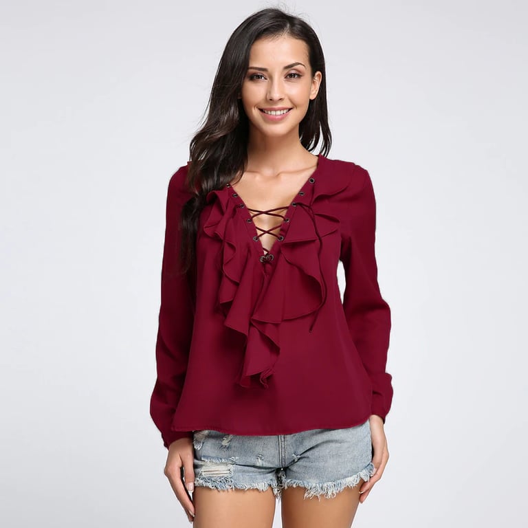 Damesblouse met lange mouwen. Heeft een V-hals met vetersluiting en is versierd met ruffles.