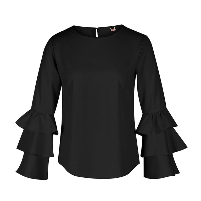 Damesblouse met lange mouwen, versierd met volants. Het heeft een ronde hals en sluit met een knoop aan de achterkant.
