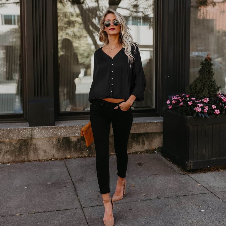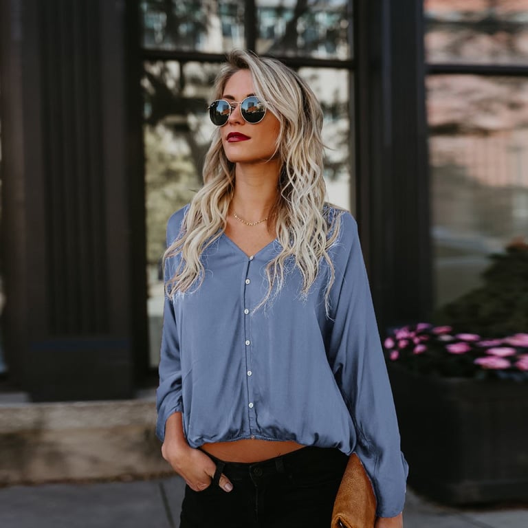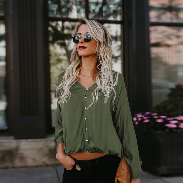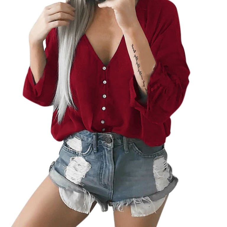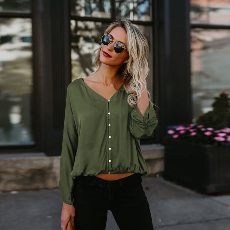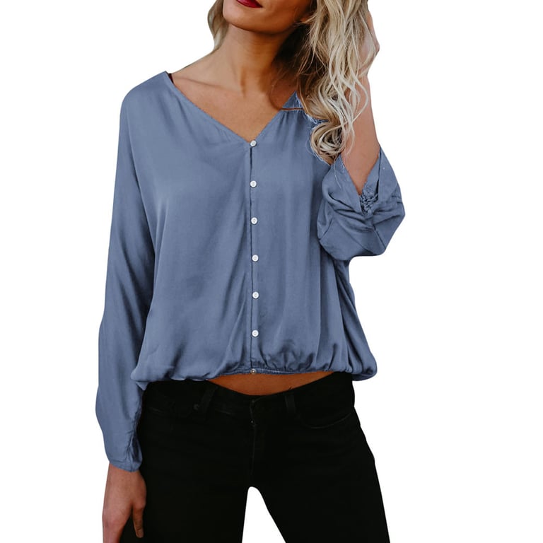 Deze prachtige damesblouse heeft decoratieve witte knopen. Hij is in de taille lichtjes gerimpeld met elastiek en heeft een diepe V-hals. Een elegante snit die elke vrouw staat.