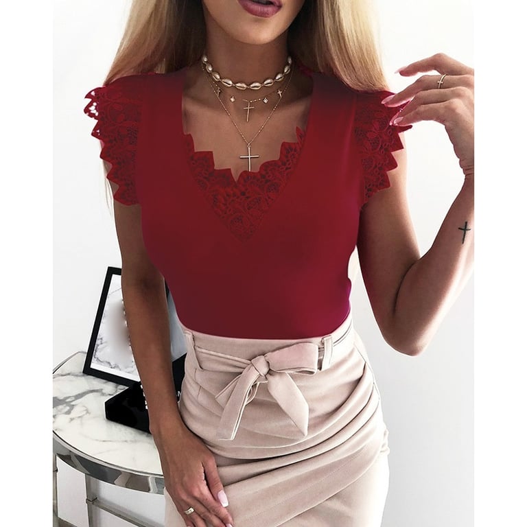 Damesblouse met korte kanten mouwen en kant bij de hals. Verkrijgbaar in prachtige heldere kleuren.