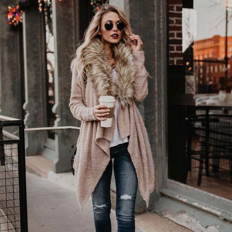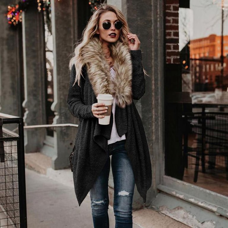 Stijlvolle jas met modieus bont. Asymmetrische snit. Twee kleuren.
