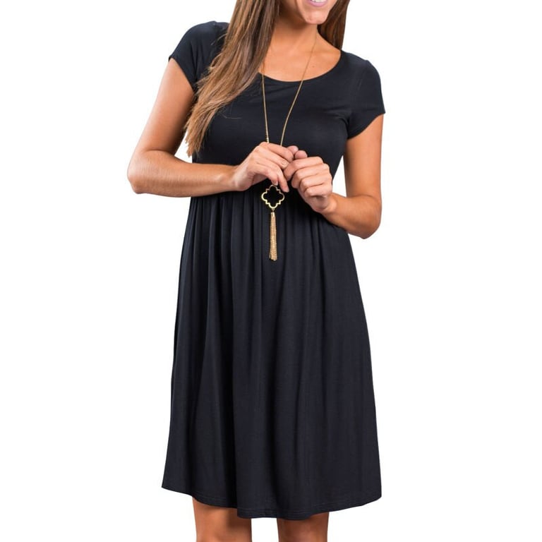 Dames lichte jurk met korte mouwen en een ronde hals. Rok in A-lijn met plooien en een lengte boven de knie. Verkrijgbaar in meerdere kleurvarianten.