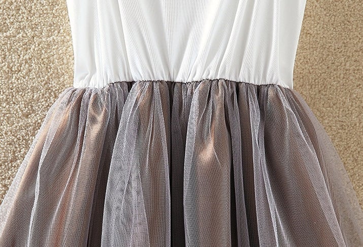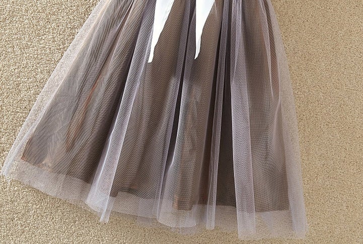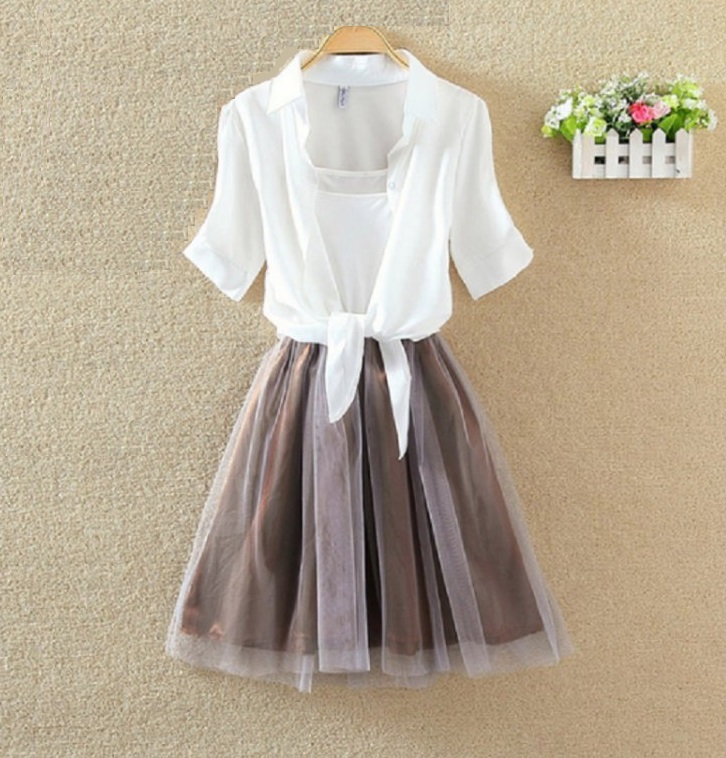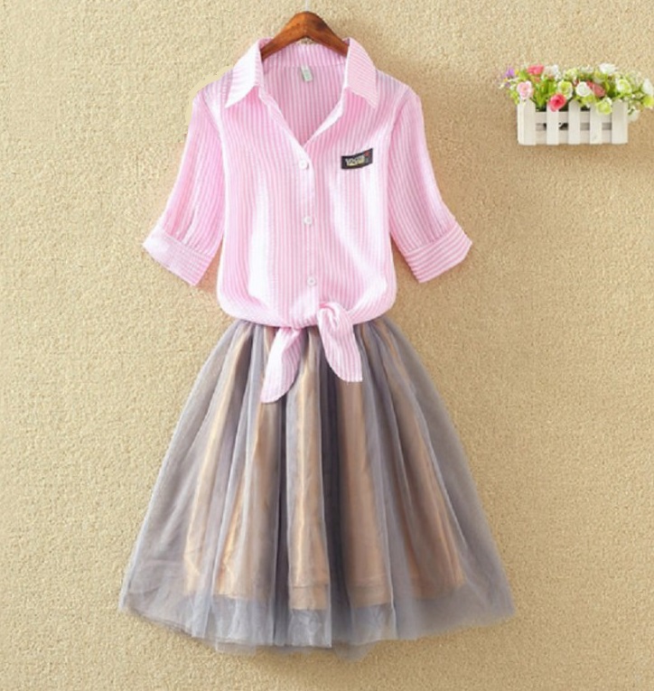 De rok is grijs, de top is wit en de blouse is verkrijgbaar in 3 kleuren.