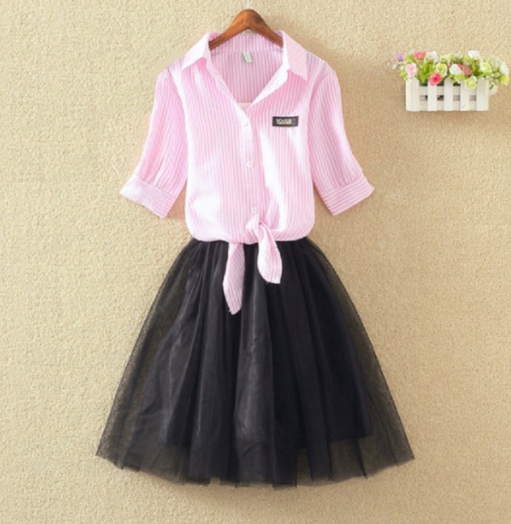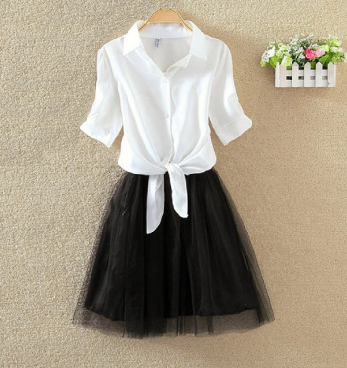 De rok is zwart, de top is wit en de blouse is verkrijgbaar in 4 kleuren.