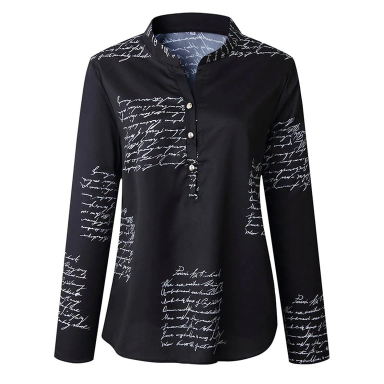 Dames blouse met lange mouwen. Heeft een V-hals en een stijlvolle print met tekst. U kunt kiezen uit twee kleuren.