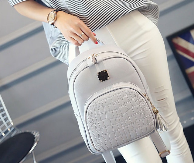 De voorzak van de rugzak met een reliëfpatroon heeft een rits met nep-franje.