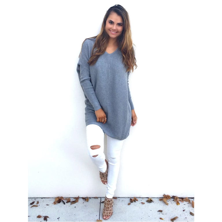 Dames comfortabele lange trui met een losse pasvorm, lange mouwen en een V-hals. Verkrijgbaar in vier kleurvarianten.