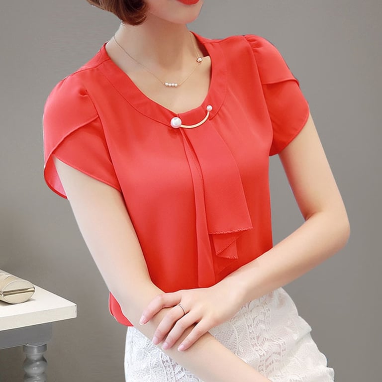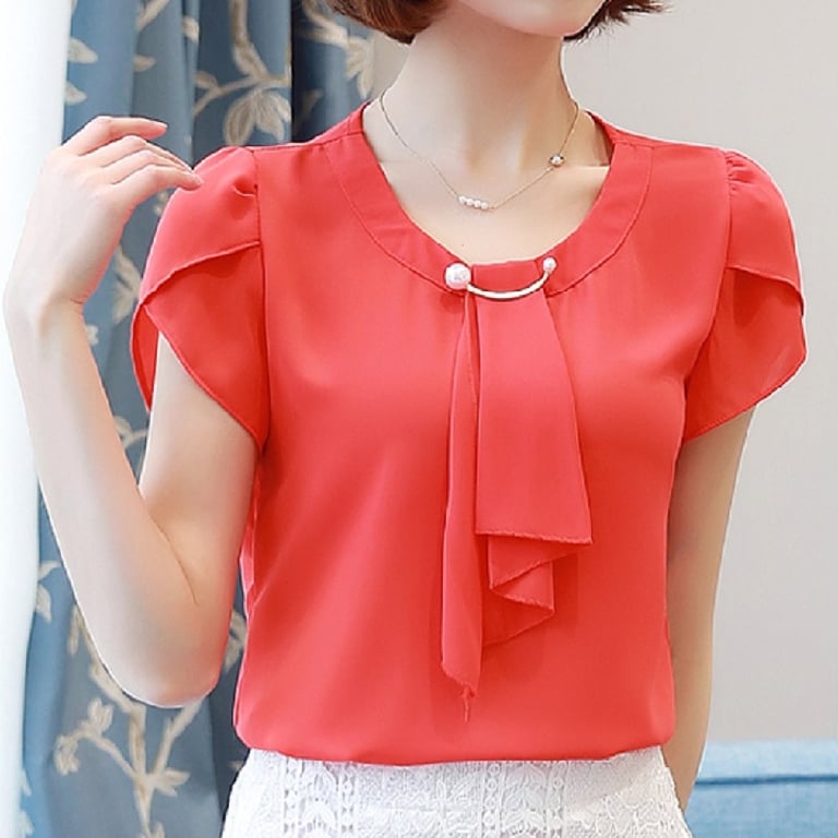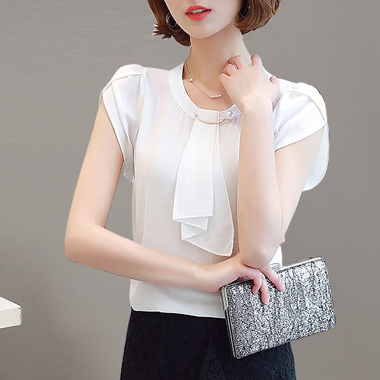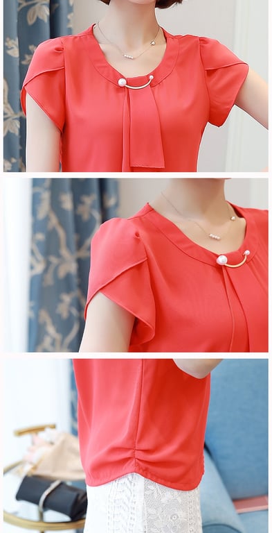 De blouse is zeer elegant. Hij heeft korte mouwen.