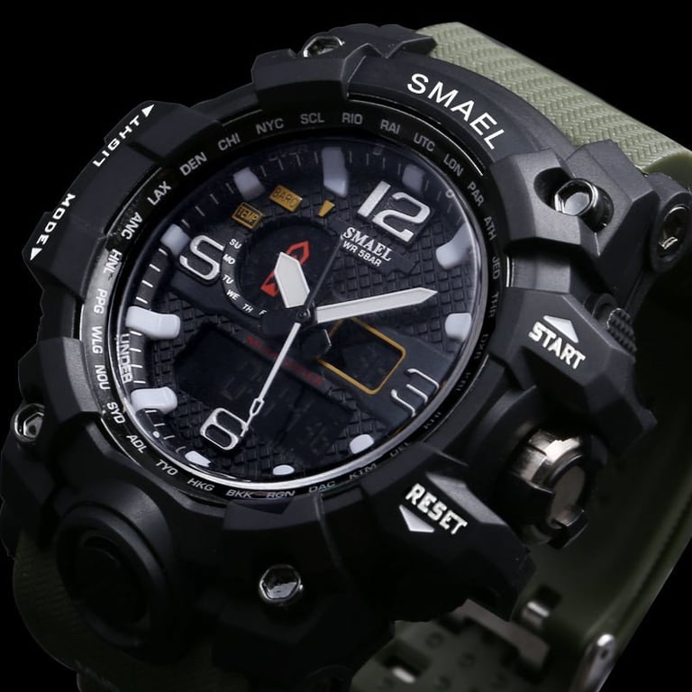 Mannelijke leger sporthorloge. LED achtergrondverlichting van het display, waterdicht tot 30 m. De bandmaat is verstelbaar van 14 – 22 cm.