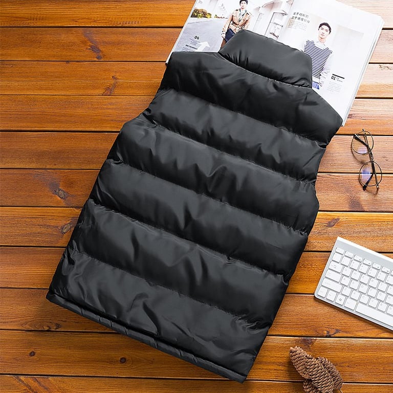 Mannelijke winter gewatteerde vest met een opstaande kraag en twee zijzakken. Beschikbaar in vier kleurvarianten.