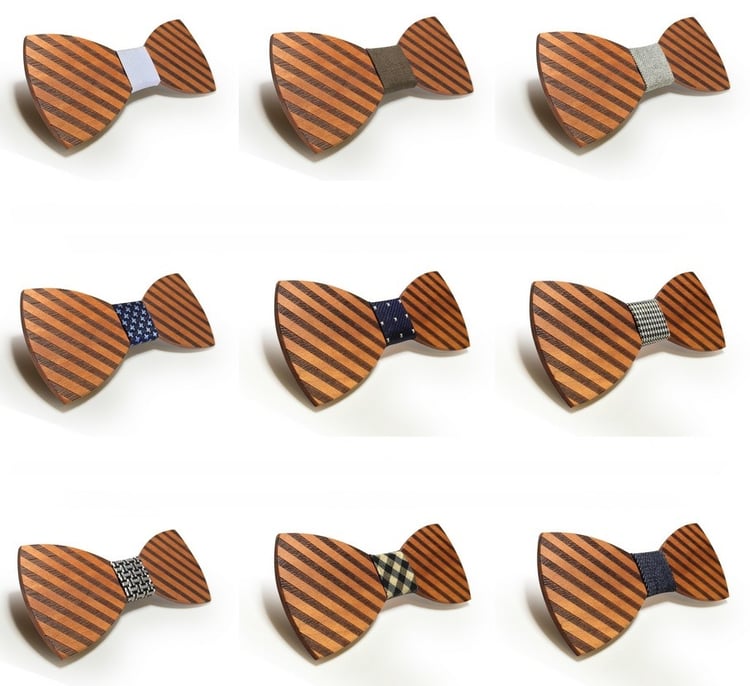 Houten vlinderdas met een gegraveerde strook in het midden, versierd met hoogwaardige textiel.