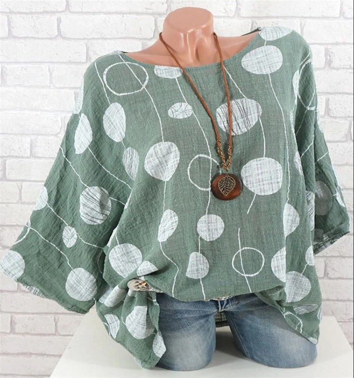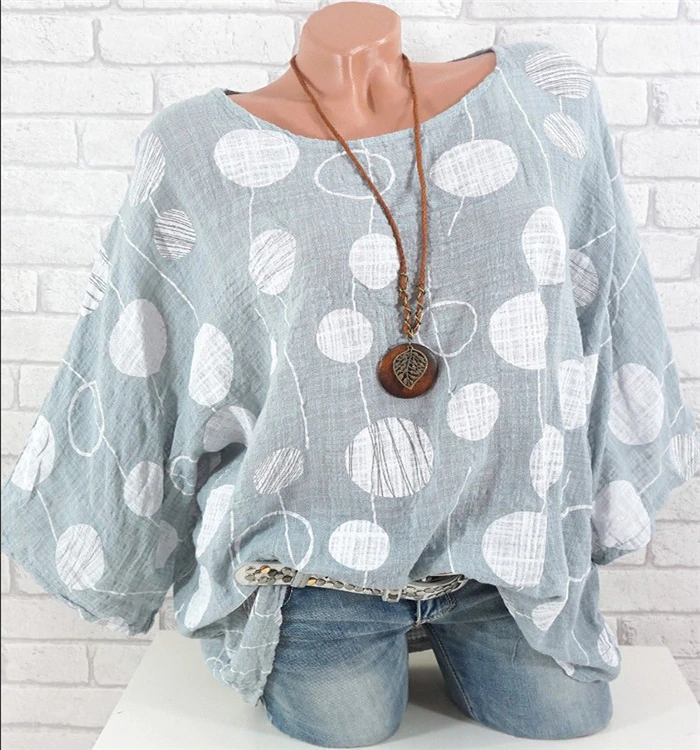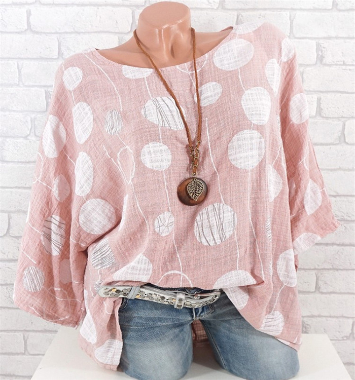 Dameslichte blouse ideaal voor de zomer. Mooie kleuren, versierd met grote stippen.