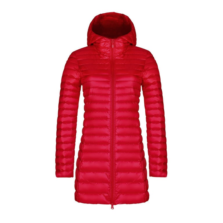 Lang dames gewatteerde jas met capuchon en zakken. Glanzend effect.