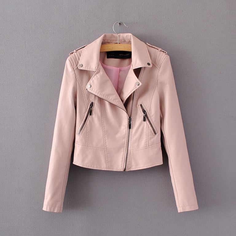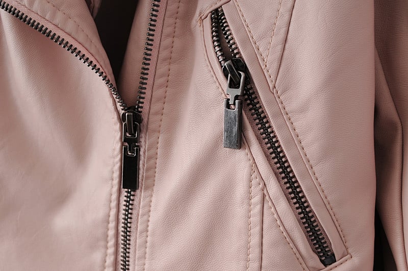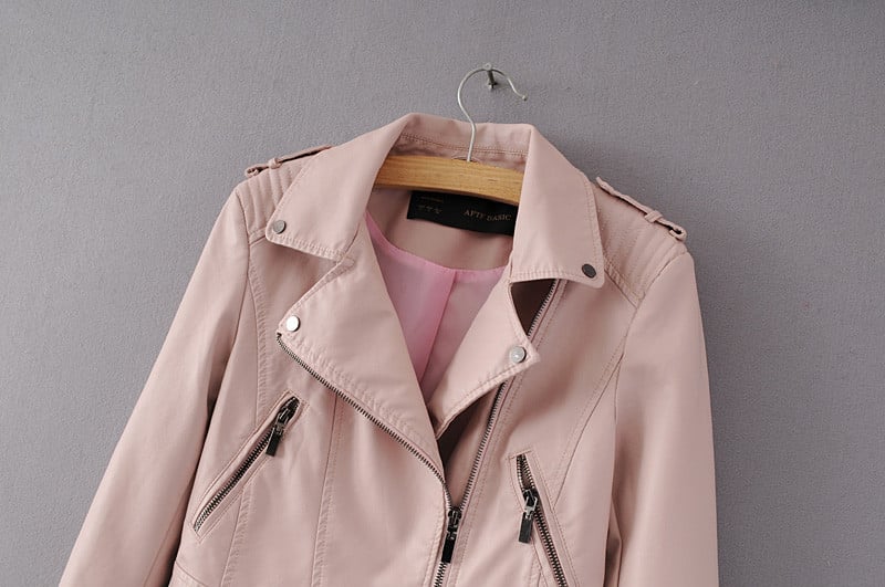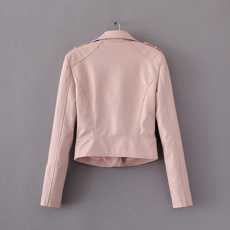 Luxueuze damesmotorjack in motorkledingstijl, gemaakt van kunstleer.