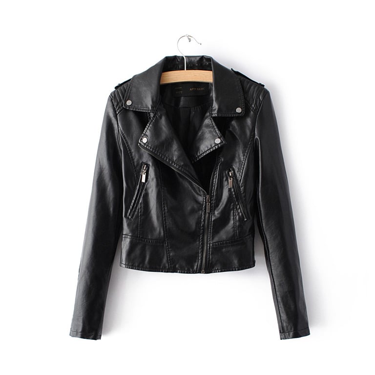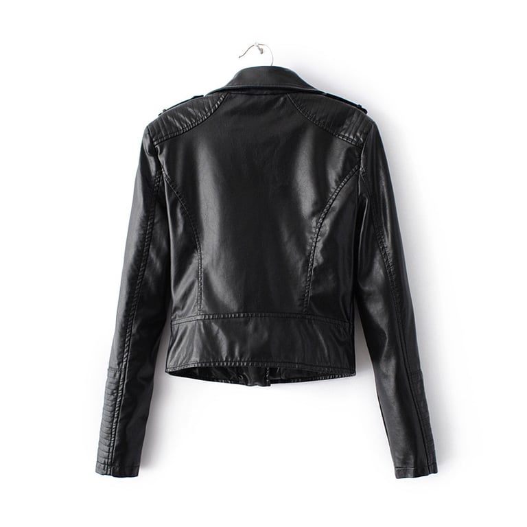 Luxueuze damesmotorjack in motorkledingstijl, gemaakt van kunstleer.
