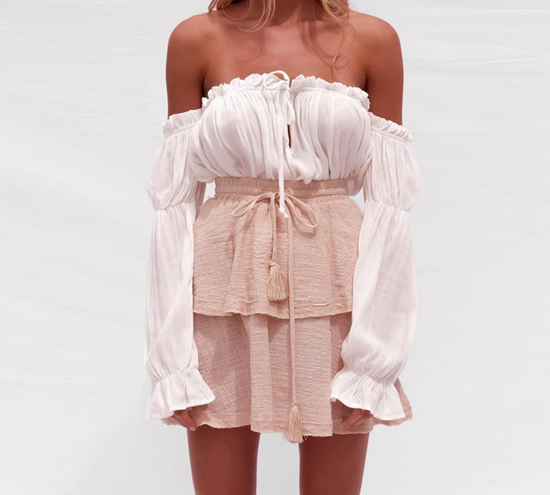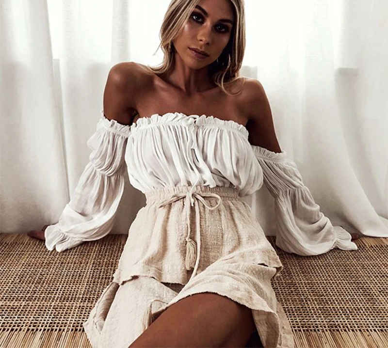 Dames stijlvolle blouse met lange mouwen en blote schouders. Modieuze snit ideaal voor de zomerperiode.