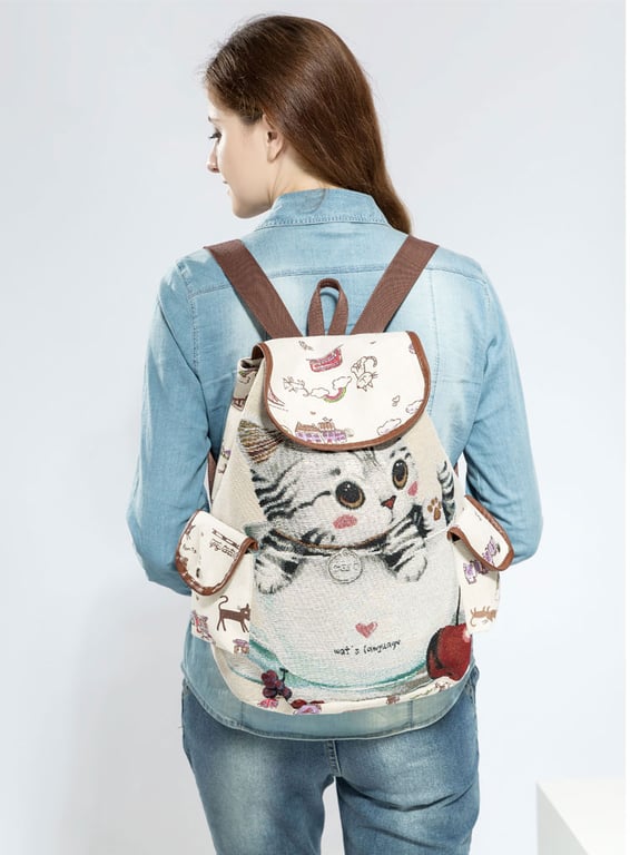 Houd je van katten? We hebben een schattige rugzak van het type met trekkoord met een kattenprint voor u. Het sluit met een trekkoord aan de bovenkant van de rugzak.