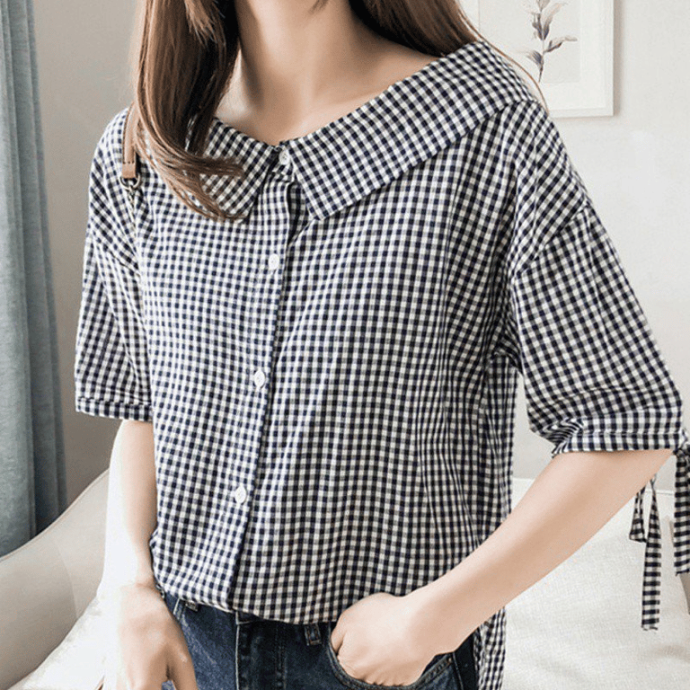 Dames geruite blouse met kraag. Sluit met knopen. Heeft 3/4 mouwen die met een strik worden vastgebonden.