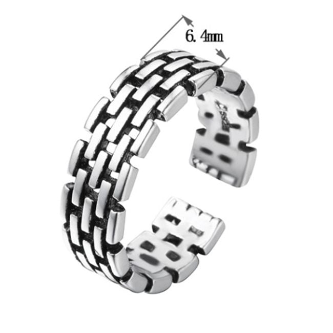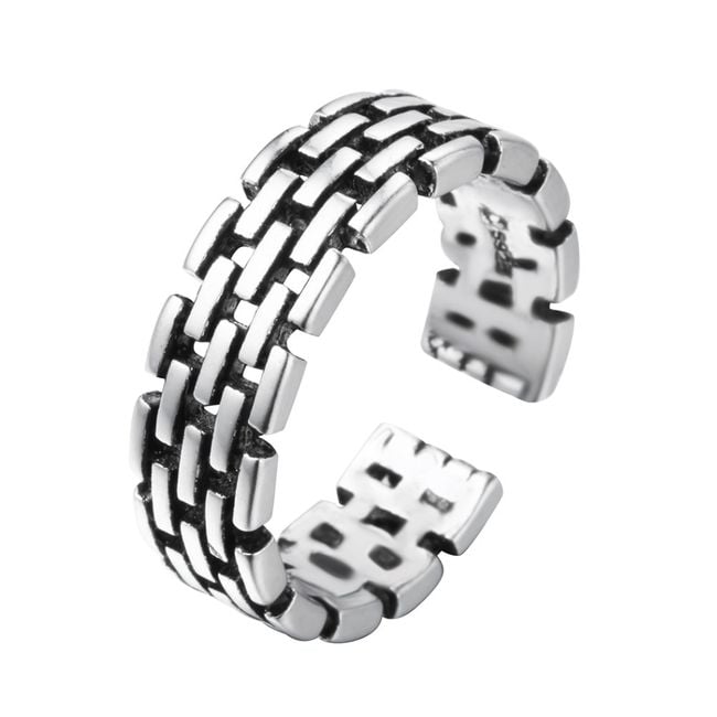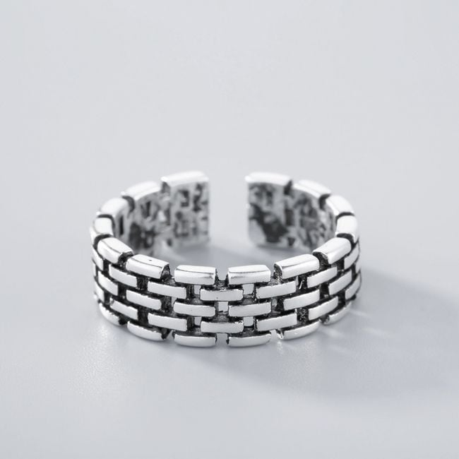 Vrouwelijke interessante ring in zilverkleur, die doet denken aan kleine bakstenen.