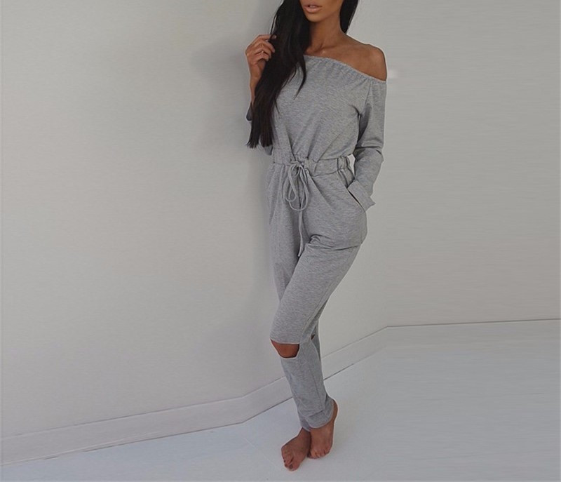 Dames lange jumpsuit met een strik in de taille, blote schouders, gaten op de knieën en een strik in de taille.