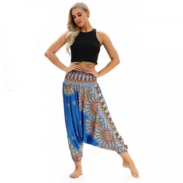 Dames aladink broek met een lage taille en smalle pijpen. Vrije comfortabele pasvorm. Bedrukt met een kleurrijk patroon. Verkrijgbaar in meerdere varianten.