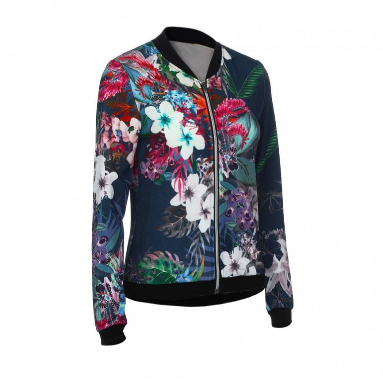 Dames lichte bomberjack. Het jack is zonder capuchon, met een lage kraag en een ritssluiting. Blauwe uitvoering met een bloemenpatroon bedrukt.