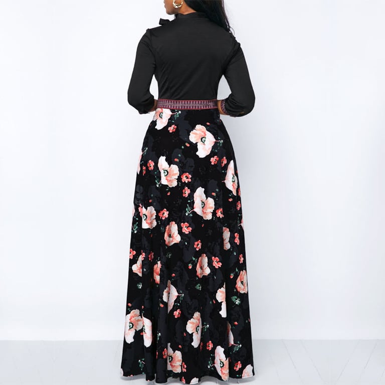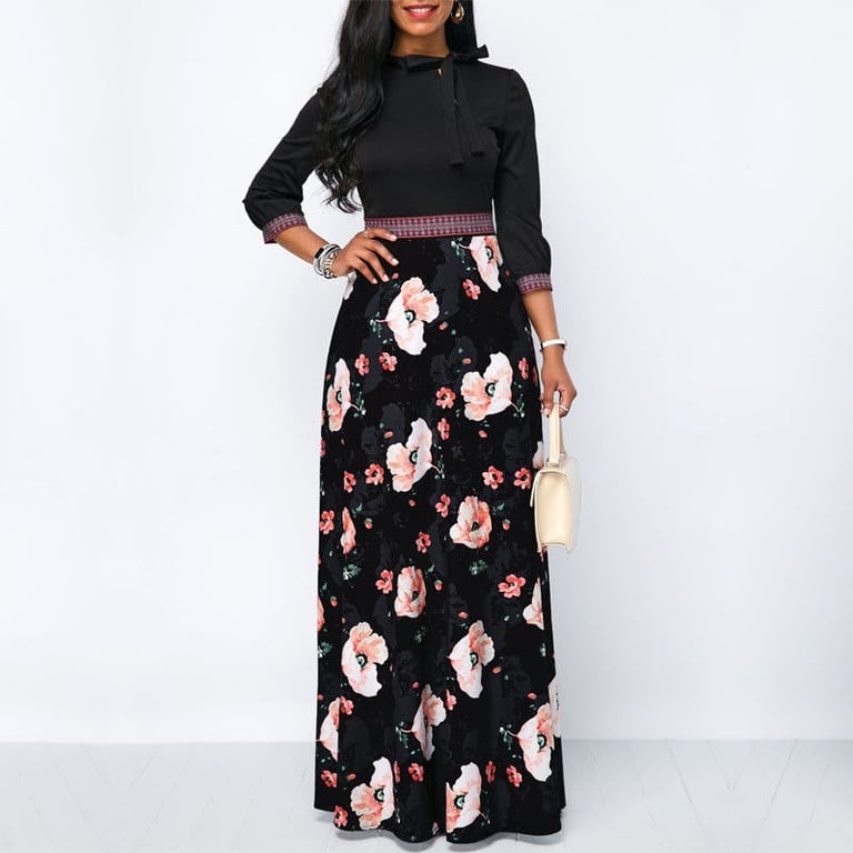 Damesjurk met lange rok en bloemenpatroon. De jurk heeft driekwart mouwen en een halslijn met strik.