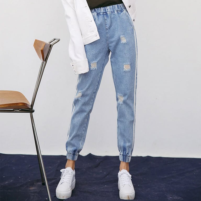 Dames boyfriend denim jeans met decoratieve scheuren. Brede pijpen met een zijstreep. Elastische tailleband van rubber.