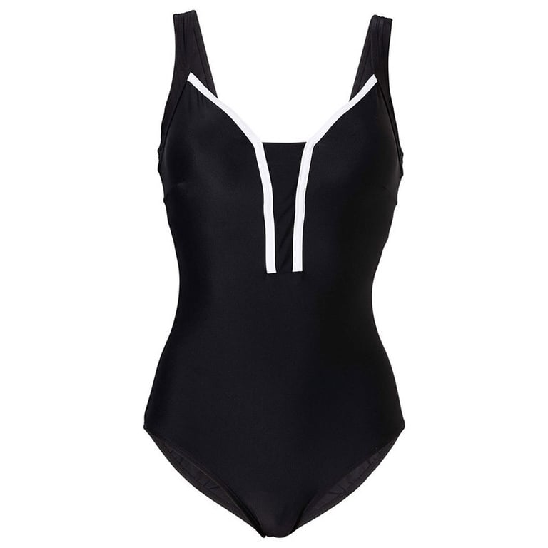 Dames eendelig badpak met smalle bandjes. Elegante zwarte uitvoering met een decolleté met witte rand. Het badpak heeft een push-up effect en heeft een licht uitgesneden onderkant.