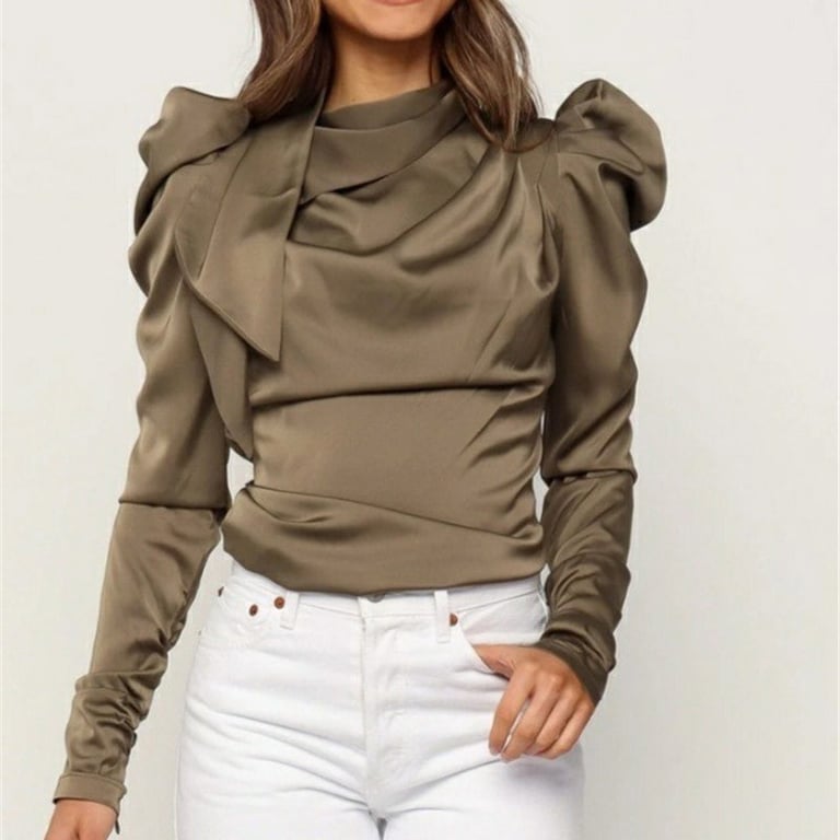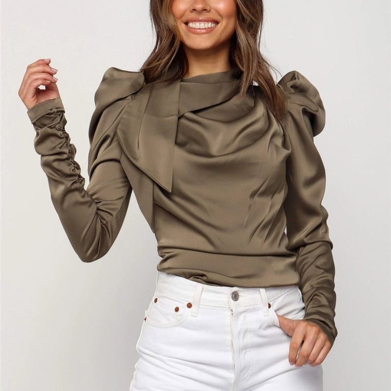 Damesblouse met een interessant ontworpen lange mouw. Strak model met plooien. Glad glanzend materiaal. Verkrijgbaar in meerdere kleuren.