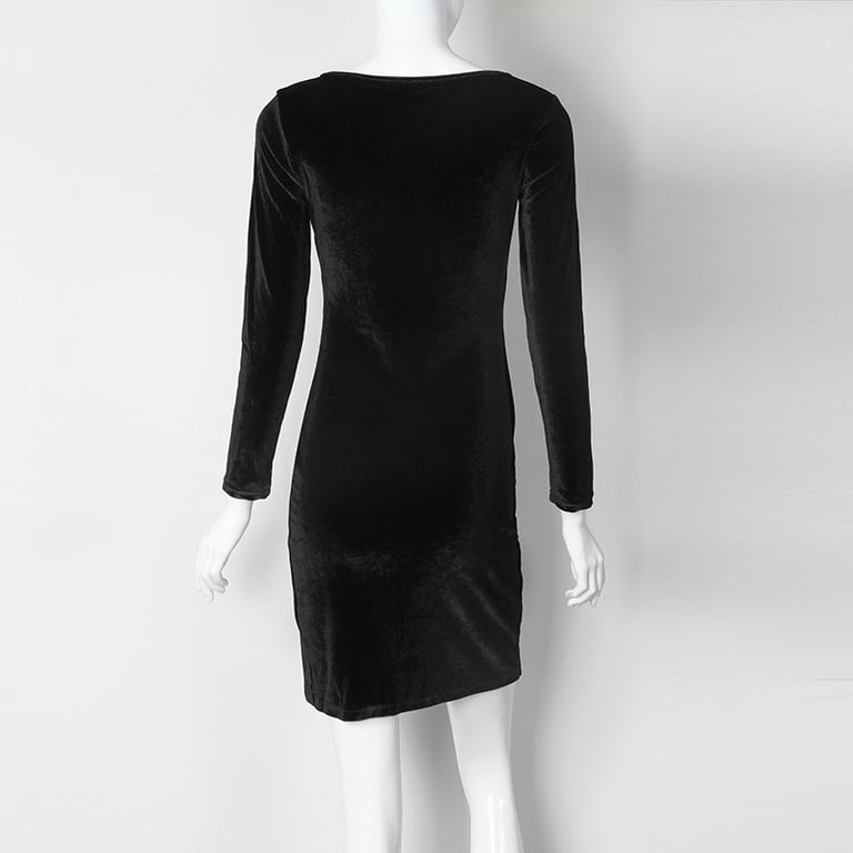 Dames korte fluwelen jurk met lange mouwen. De jurk heeft een asymmetrische snit en een diepe V-hals. Ideaal voor een feestje of evenement. Verkrijgbaar in verschillende kleuren.