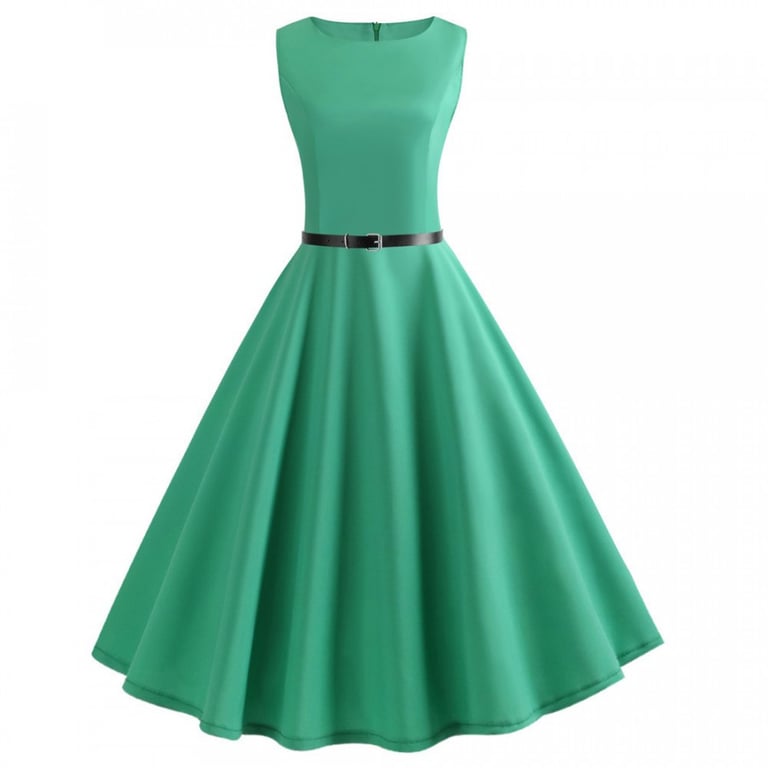 Damesjurk in vintage stijl. De jurk is mouwloos met brede schouderbanden en een ronde halslijn. Brede A-lijn rok en een riem met gesp in de taille. Beschikbaar in verschillende kleuren.