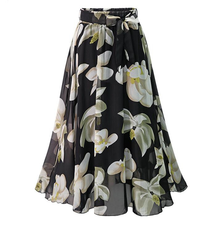 Dames luchtige rok met hoge taille en strikband. Vrije lange snit met kleurrijk bloemenpatroon. Verkrijgbaar in twee varianten.