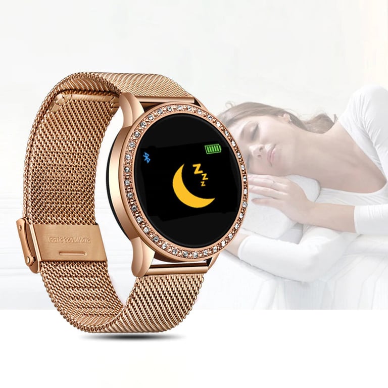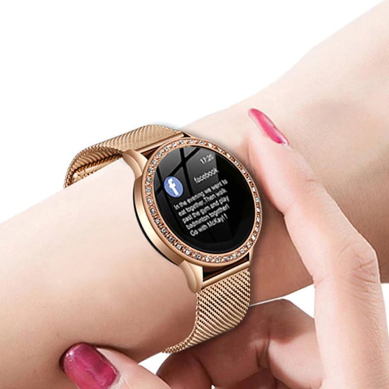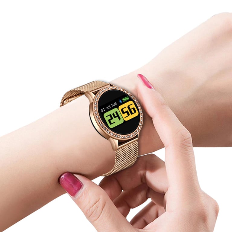 Dames elegante horloge met slimme functies en een stijlvolle uitstraling. Het apparaat toont het aantal stappen, de hartslag en natuurlijk ook de tijd.