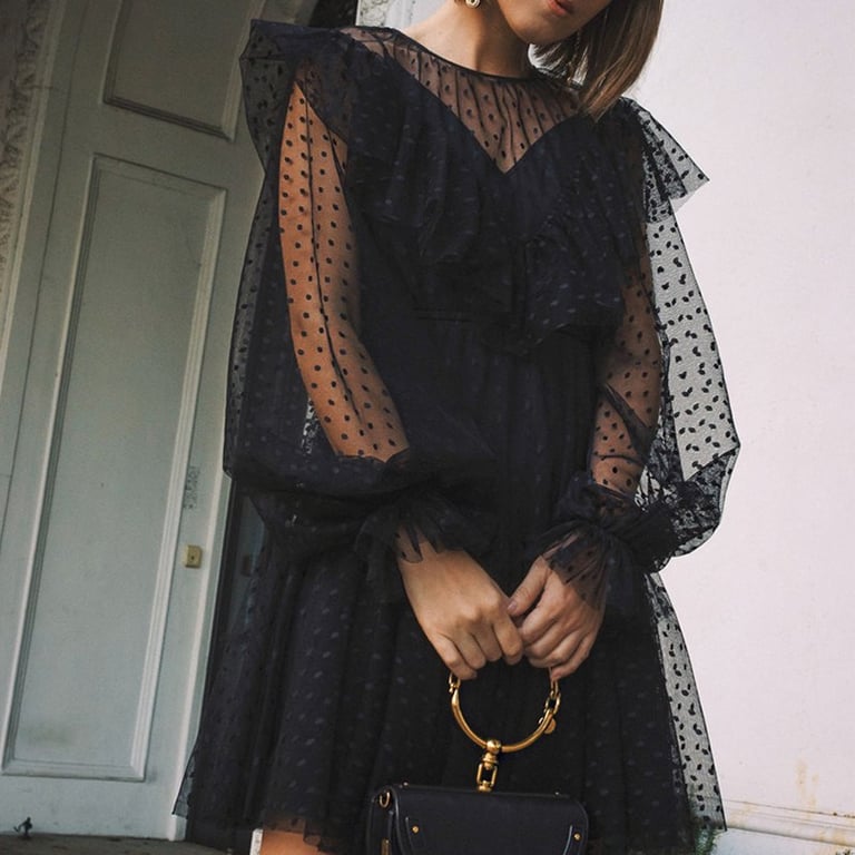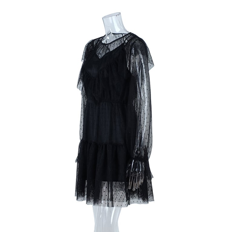 Dames korte zwarte jurk met lange mouwen en een ronde hals. Geweldig voor een feestje of evenement. De jurk heeft twee delen. Een bovenste tule met stippen en een onderste ondoorzichtige laag.