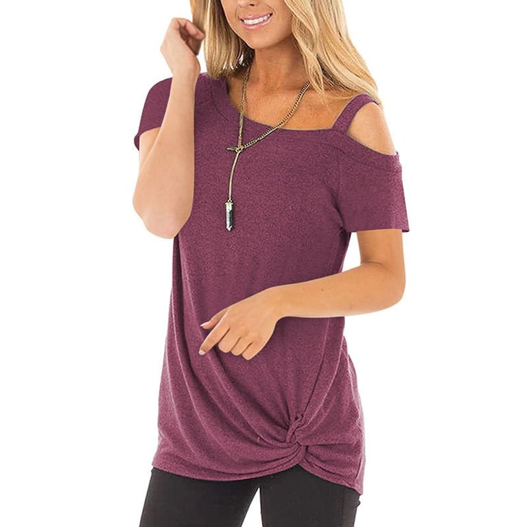 Dames top met korte mouwen en blootgestelde schouders. Losse, langere snit met knoopdetail. Beschikbaar in meerdere kleuren.