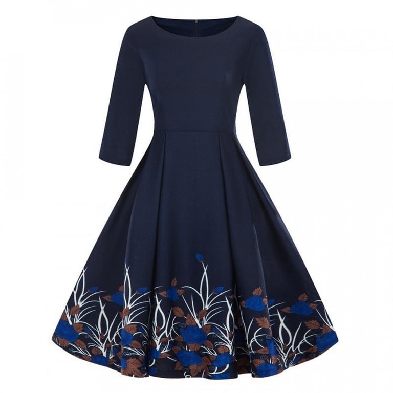 Dames vintage jurk met een brede midi rok in A-lijn. De jurk heeft lange mouwen en een ronde hals. De rok heeft een kleurrijke print. Verkrijgbaar in verschillende varianten.