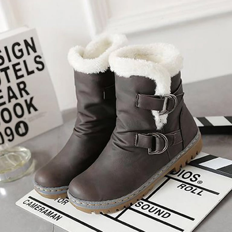 Dames winter enkellaarsjes zonder hak, versierd met gespen aan de buitenkant. De schoenen hebben een zool met een geribbeld patroon, die niet glijdt, en zijn van binnen gevoerd met warme voering.