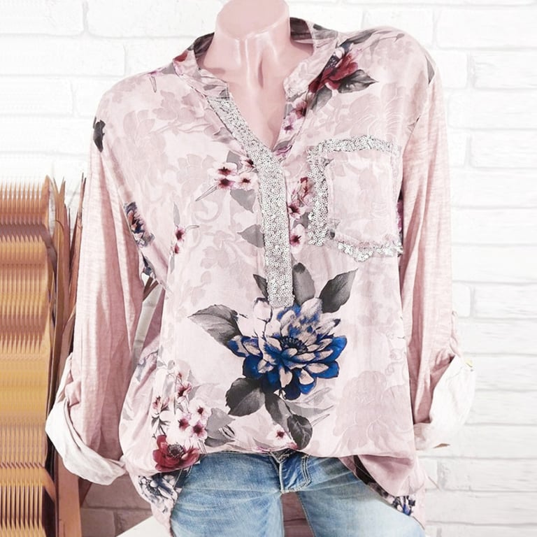 Damesblouse met lange mouwen. De blouse heeft een V-hals met een lage kraag. Borstzak. Bedrukking met bloemenpatroon. Plus size maten. Verkrijgbaar in verschillende varianten.