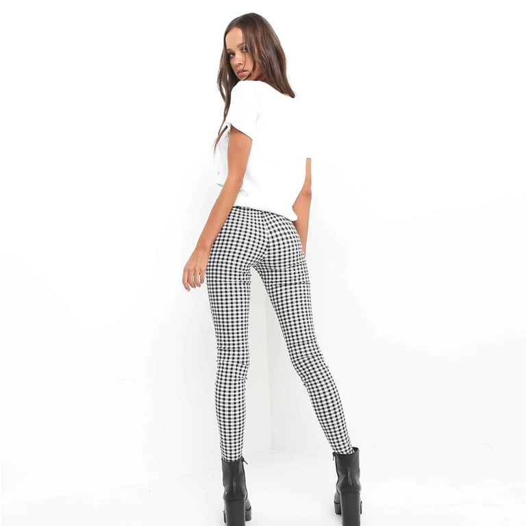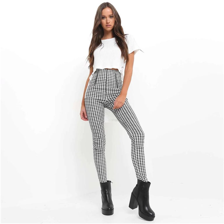 Dames stijlvolle broek met een zwart-wit geruit patroon. Hoge taille en twee decoratieve ritsen aan de zijkanten. Aangenaam comfortabel materiaal.