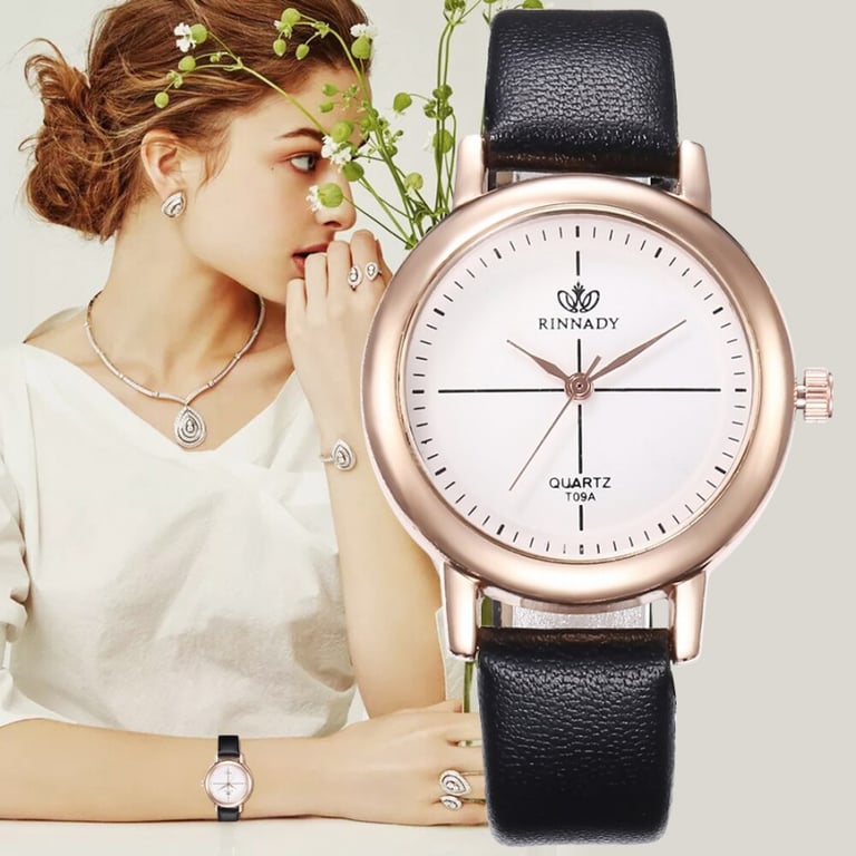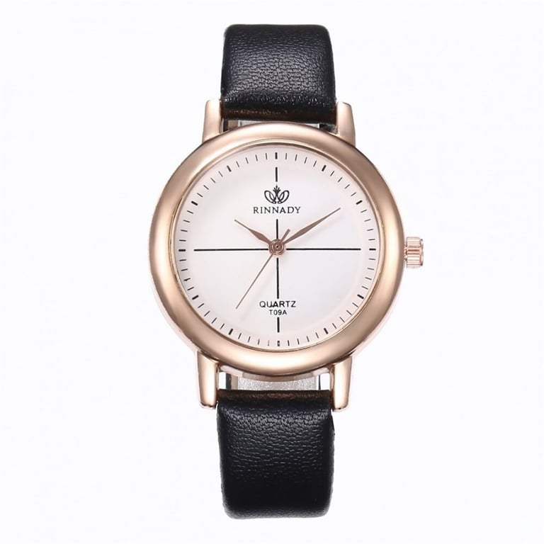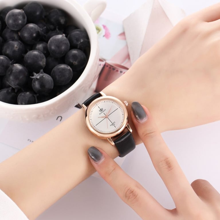 Dameshorloge met een leren band. Wijzerplaat zonder cijfers in een metalen frame.