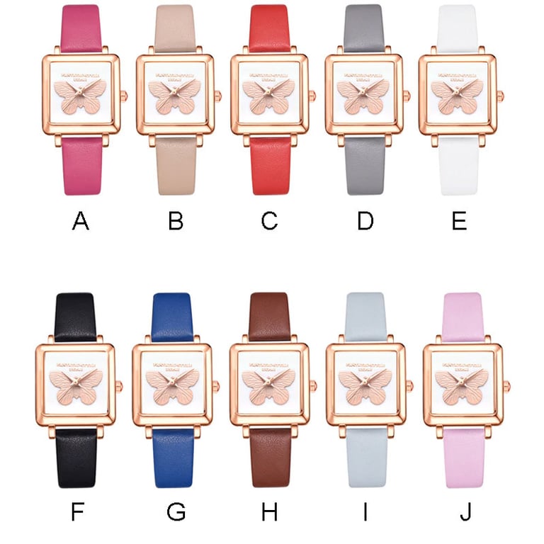 Dameshorloge met verstelbare leren band. Wijzerplaat in een vierkant metalen frame met een vlinder. Meer kleurvarianten beschikbaar.