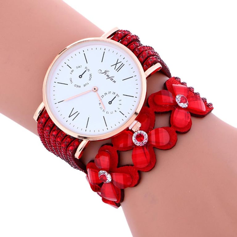 Dames polshorloge. Band versierd met steentjes. Wijzerplaat zonder nummering. Meer kleurvarianten.